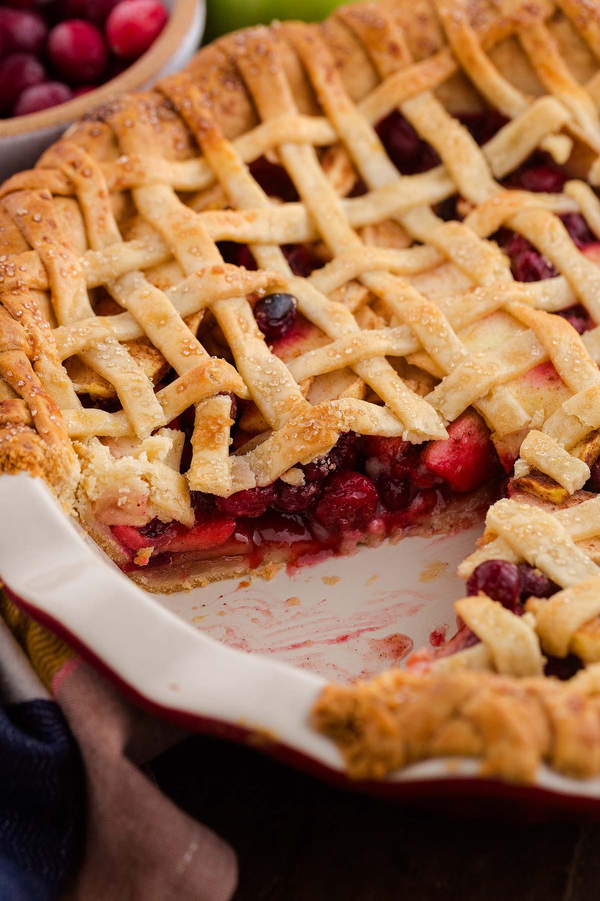 Store: Keep the apple cranberry pie covered at room temperature for up to 2 days or refrigerate up to 4 days.