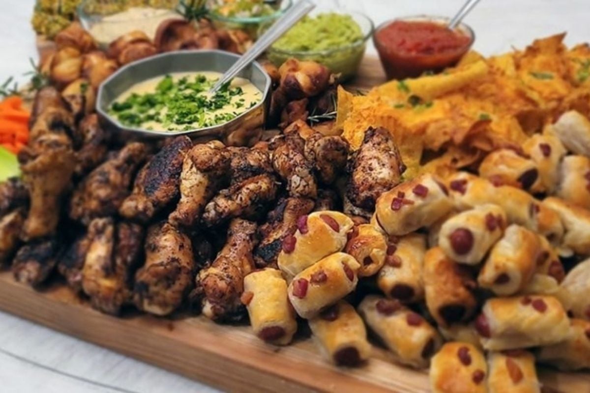 The CharDUDErie is the Ultimate Super Bowl Charcuterie that focuses on the snacks Men love… Chicken Wings, Mini Franks, Homemade Pretzel Bites and Beer Cheese, Nachos, and more!