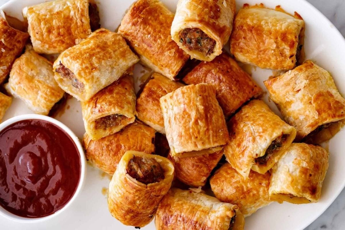 Sausage Rolls with a flavourful sausage filling wrapped in golden puff pastry makes them the perfect little appetizers for game day! Full of bacon, beef, ground pork, aromatics, herbs and spices.