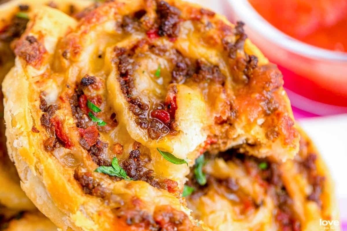 Taco Pinwheels are the perfect party food for your next celebration! These delicious puff pastries are stuffed with seasoned ground beef and melted cheese topped with your favorite taco toppings.