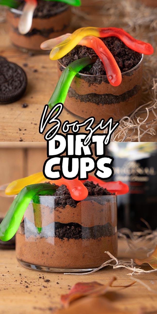 Irish cream liqueur blends into pudding and whipped topping, layered with crushed cookies and gummy snakes to make these delicious and playful boozy dirt cups.