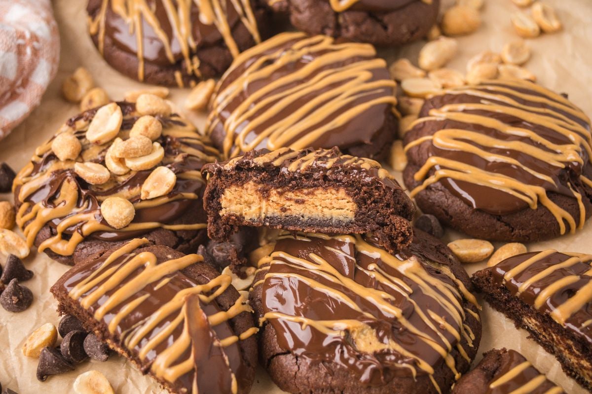 These tasty buckeye cookies are soft chocolate cookies filled with a creamy peanut butter center and finished with a melted chocolate topping.