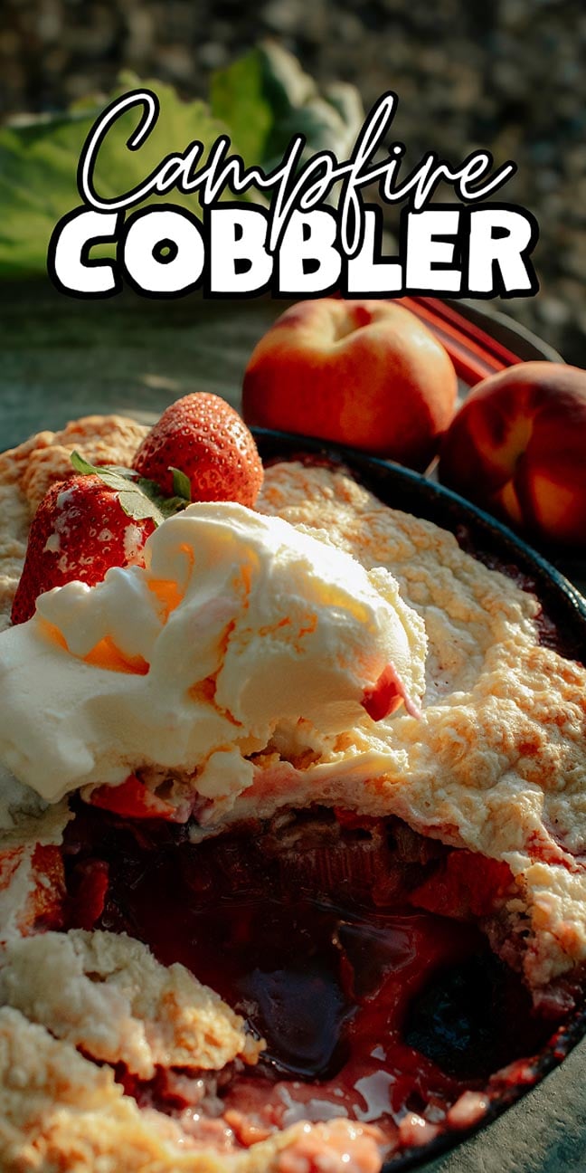 Campfire cobbler is packed with sweet summer fruit and baked to golden perfection over the hot coals. It’s easy to make outdoors if camping or on the grill at home.