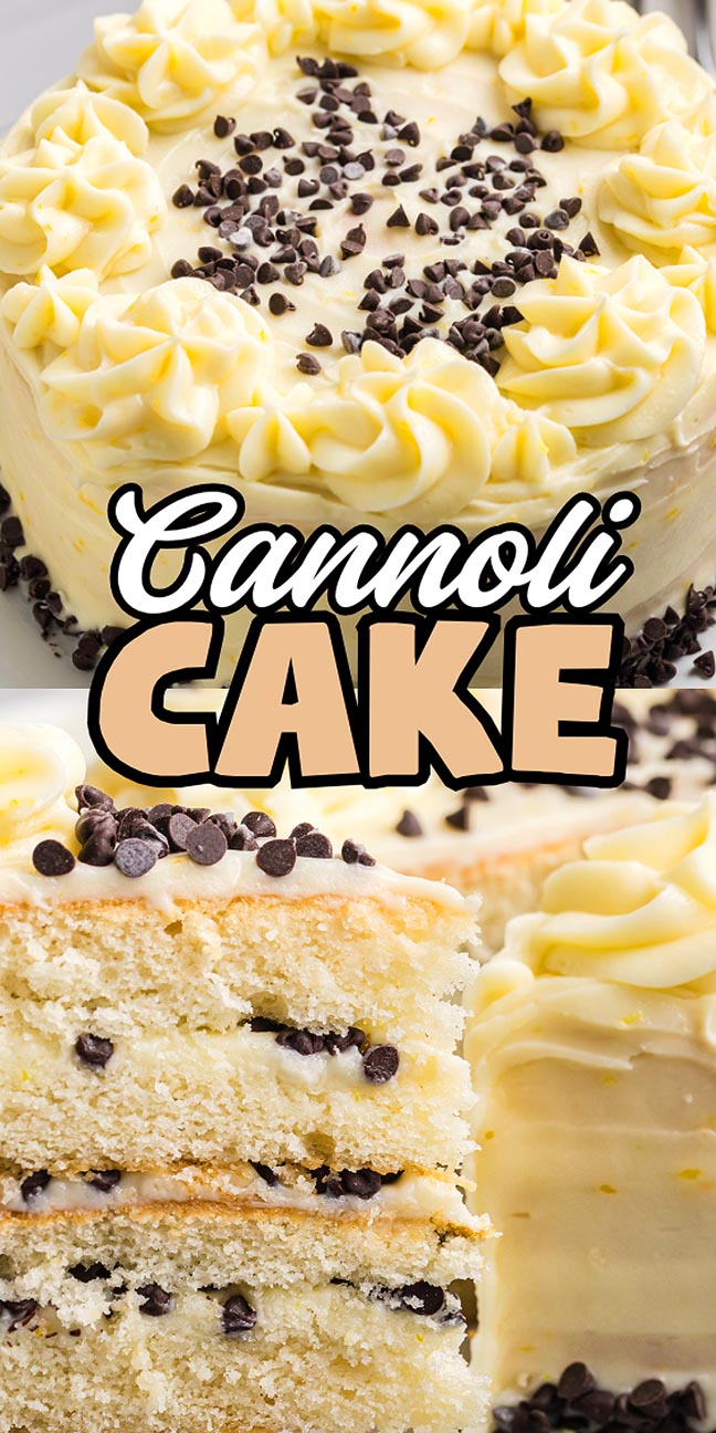 This cannoli cake takes the familiar flavor of cannoli filling and layers it into a soft white cake with a thick ricotta and mascarpone frosting. When you cut into it, you can see the chocolate chips tucked between each layer of cream, just like the filling inside traditional cannoli shells. Each slice is light with a fine crumb, and the frosting has that sweet, slightly tangy dairy flavor people love in cannoli. Orange zest runs through the cream, adding a subtle citrus note to the cake.