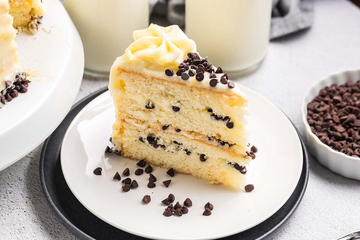 Assemble cake: Layer cake with frosting and add mini chocolate chips between each layer. Frost the exterior and add remaining mini chocolate chips on top.