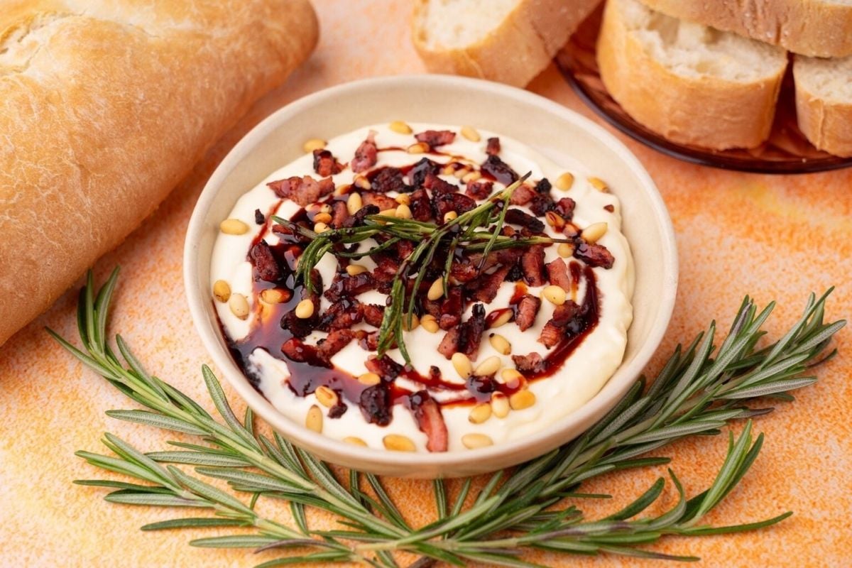 This creamy camembert dip with bacon, rosemary, and pine nuts is the perfect quick & easy appetizer or party snack for the holiday season.