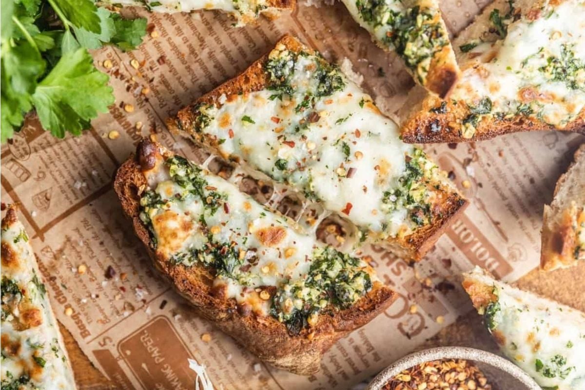 Homemade Cheesy Garlic Bread is a hearty sliced loaf slathered with butter, garlic, herbs, and cheese, then baked to crisp perfection.