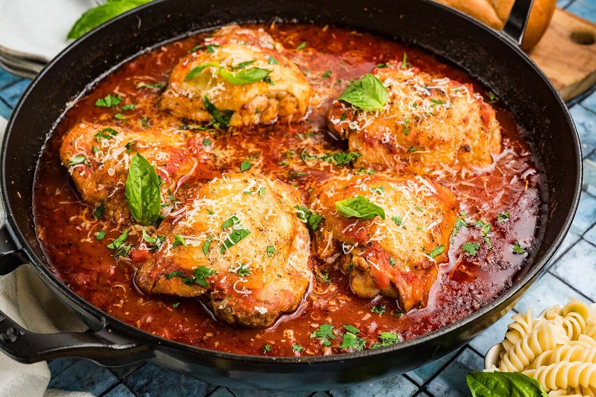 - Return the chicken to the pan, nestling it into the sauce. Cover partially and simmer for 25 to 30 minutes, until the chicken is cooked through and tender.