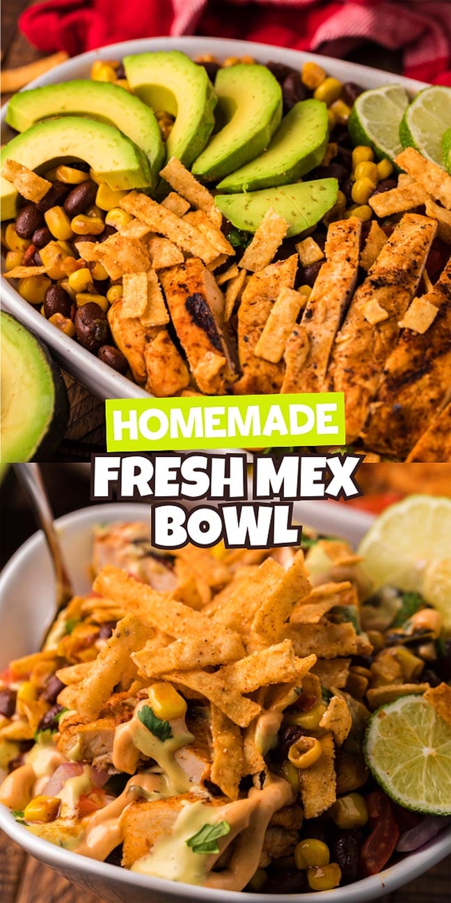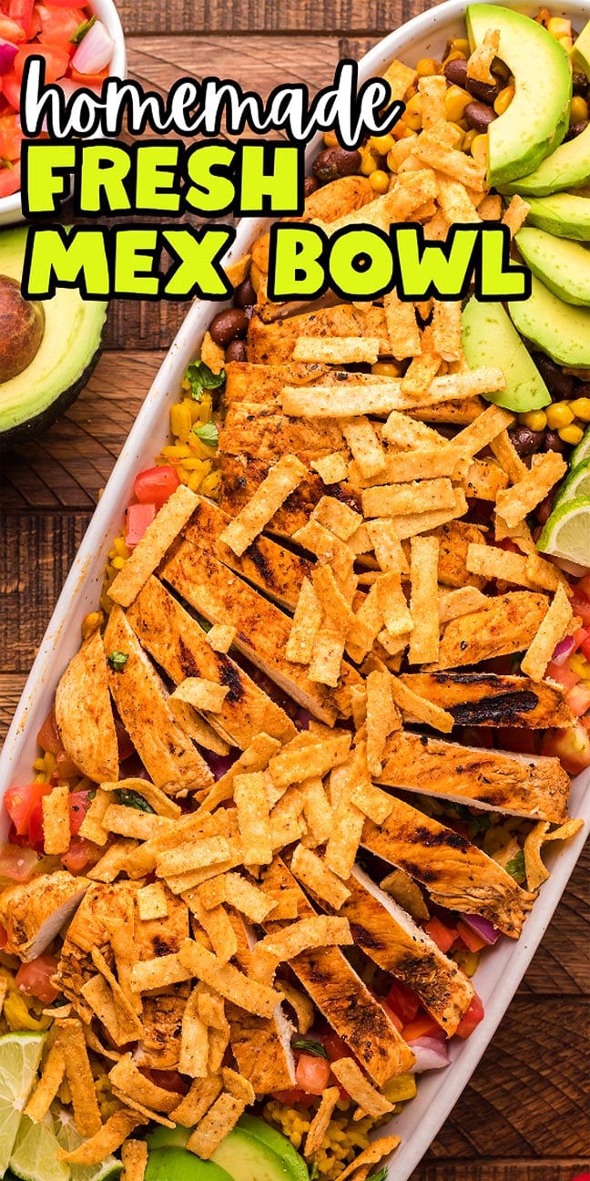 This Fresh Mex bowl is a layered dish featuring perfectly grilled chipotle chicken, zesty rice, black beans, sweet corn, creamy avocado, and fresh toppings in every bite.