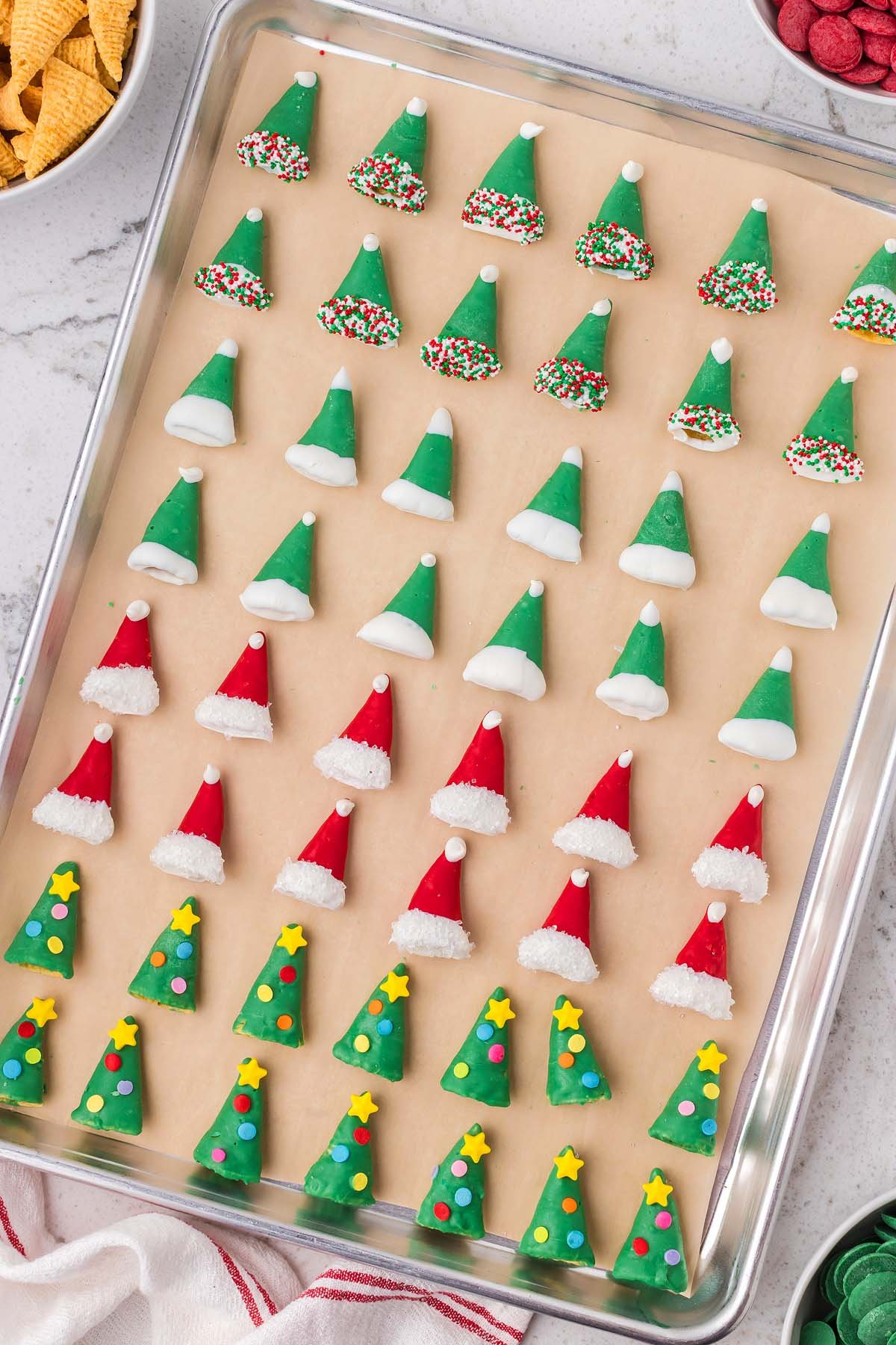 - Working with a few Bugles at a time, dip them into the red candy for Santa hats, or the green candy for elf hats.