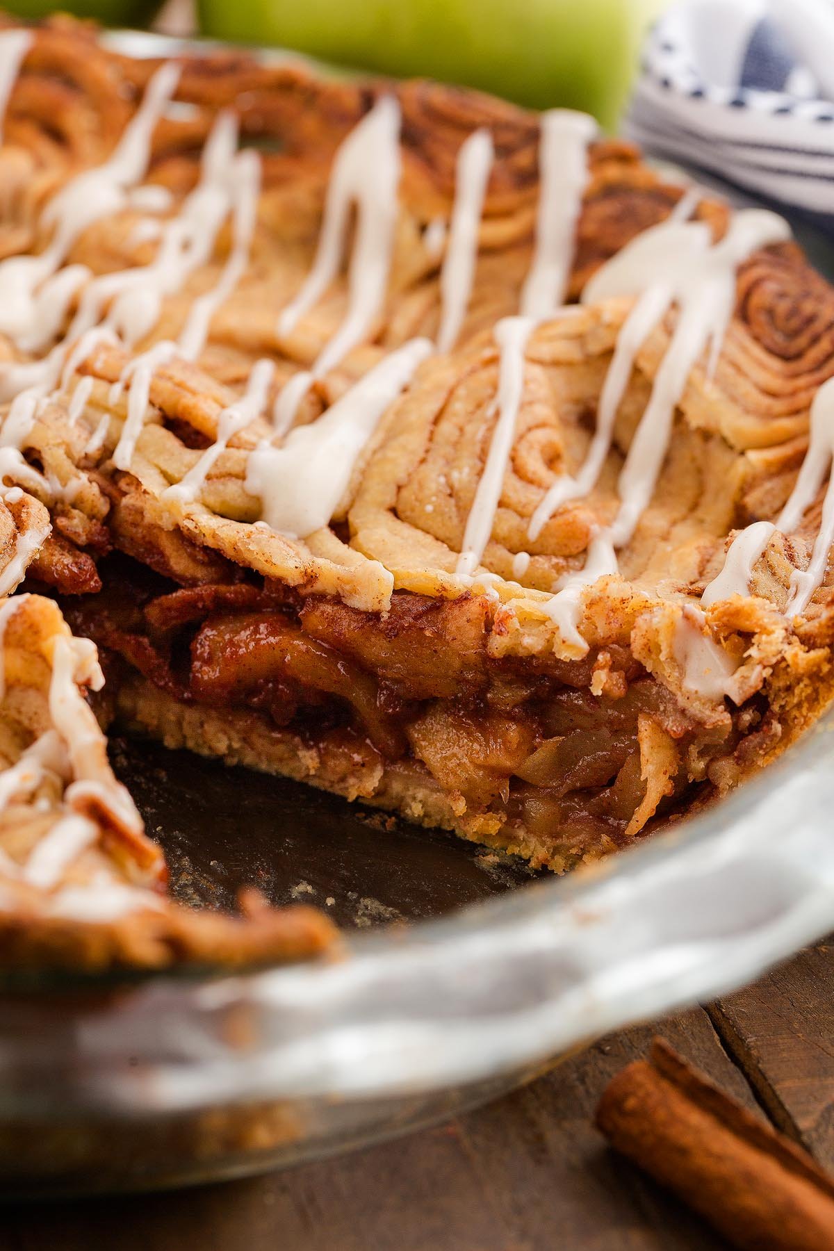 Glaze when cooled: Whisk sugar, milk and cinnamon then drizzle over the cooled pie.