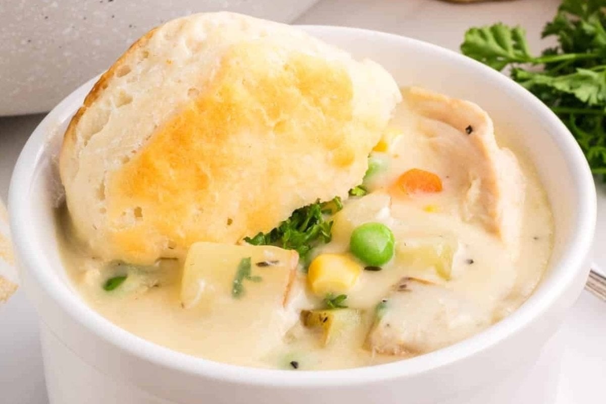 This Chicken Pot Pie Soup Recipe is filled with sweet carrots, onions, peas, and corn with tender potatoes and chicken with biscuits!