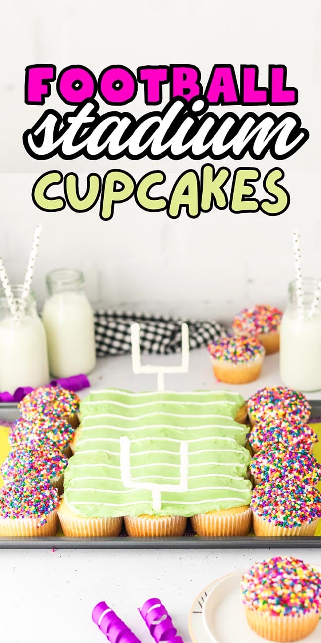 Football stadium cupcakes use pull-apart cupcakes to make an edible football field with frosting details, sprinkle stands and candy goalposts for a creative dessert.