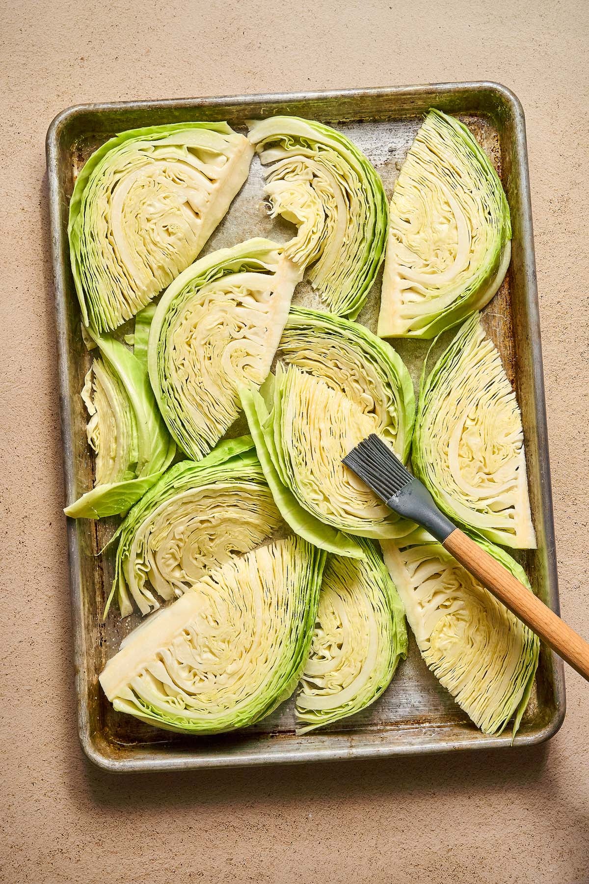 - Arrange the cabbage on the prepared sheet pan and brush with the remaining 2 tablespoons neutral oil.