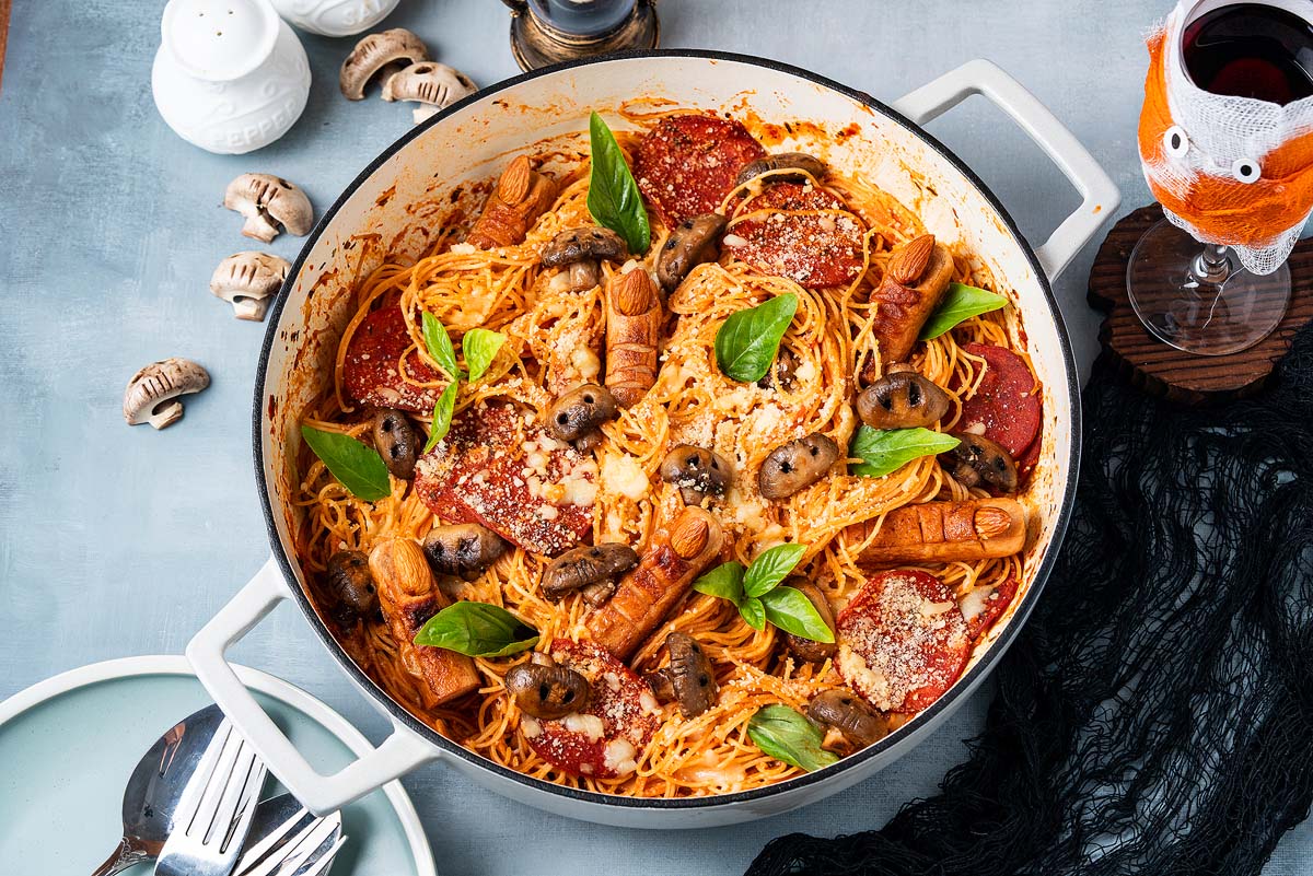 This Halloween pasta combines skull-shaped mushrooms, finger-like sausages, and crispy pepperoni with cheesy marinara spaghetti for a spooky, kid-approved meal.