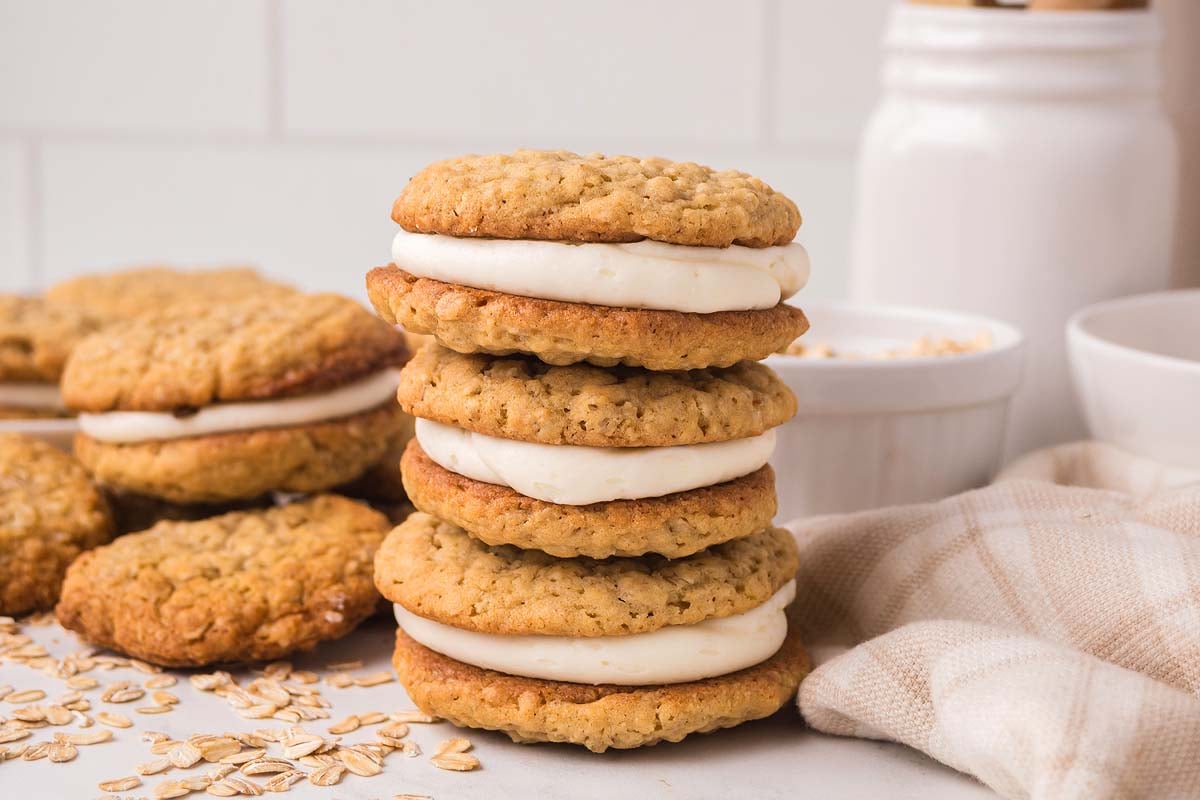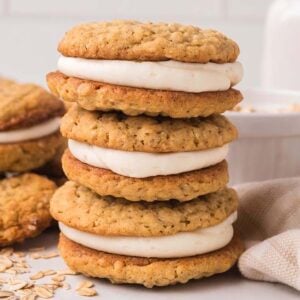 Homemade oatmeal cream pies are made by sandwiching soft oat cookies with a simple buttercream filling. The chewy oatmeal cookies have a tender crumb from the mix of oats and hold their shape well once baked, making them easy to fill and stack. The creamy filling adds sweetness and richness between the layers without taking over the cookie itself. Once assembled, they’re sturdy enough to handle but still soft to bite into, making them a solid choice for a homemade version of a familiar treat.