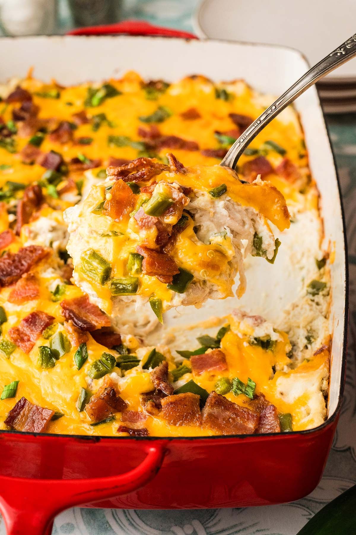 Warm, cheesy and the right amount of spicy, this jalapeño popper casserole is comfort food with a kick. Cream cheese and sour cream make it rich and creamy, while shredded chicken and crispy bacon add hearty satisfaction. Diced jalapeño peppers bring a little heat without overwhelming the flavor. It’s easy to assemble, bakes into a bubbly golden top and is perfect for a potluck or weeknight dinner.