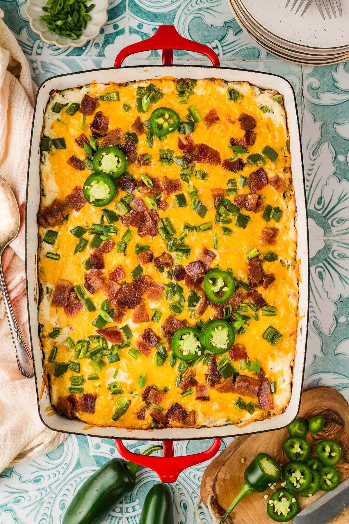 Side dishes: Pair your jalapeno popper casserole with a baked potato, rice, a rice and beans mix, tortillas, or bread. You could also make a simple side salad for a full meal.