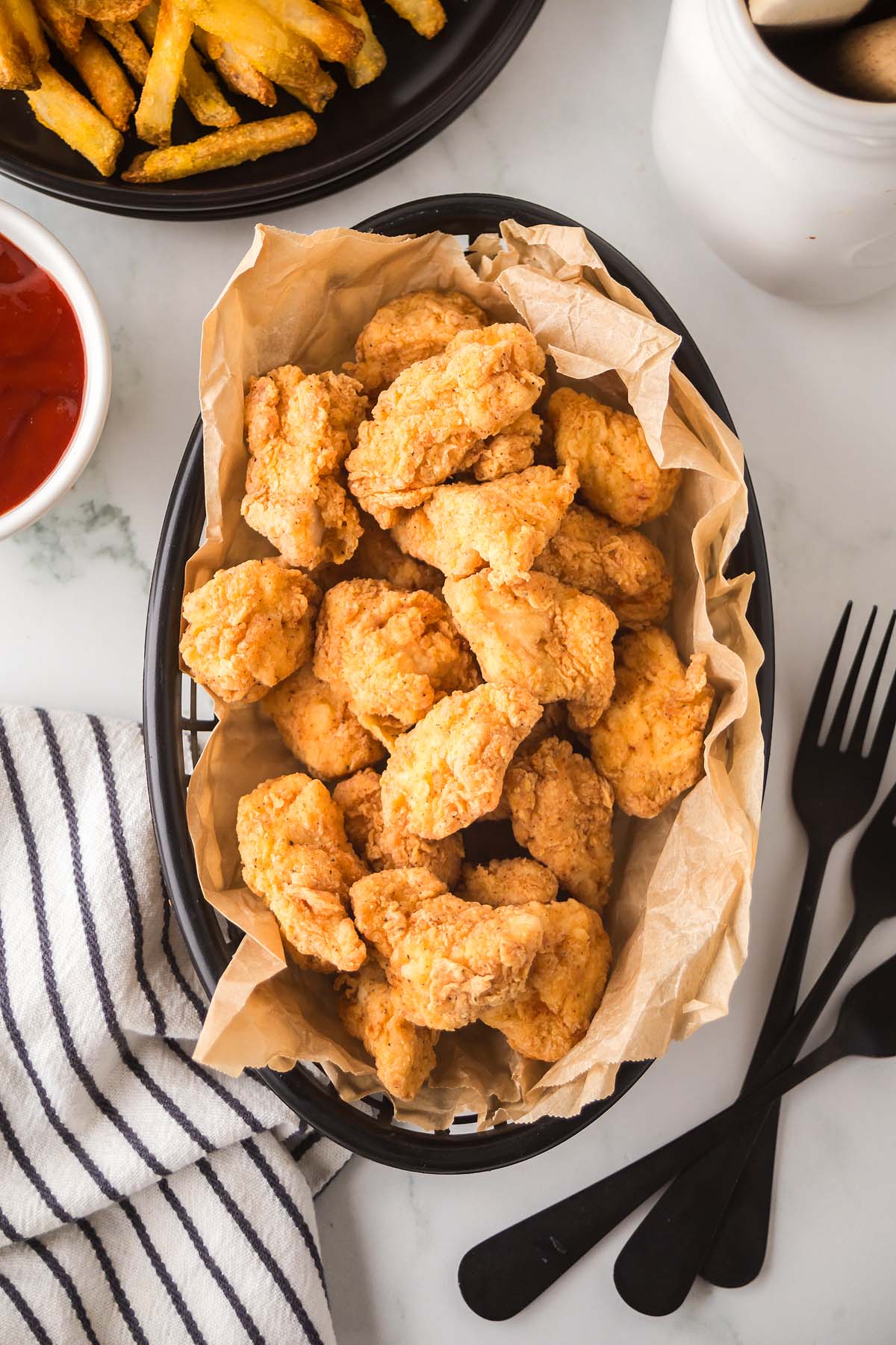 Drain properly: Let your popcorn chicken pieces rest on a paper towel lined sheet pan so they crunchy.