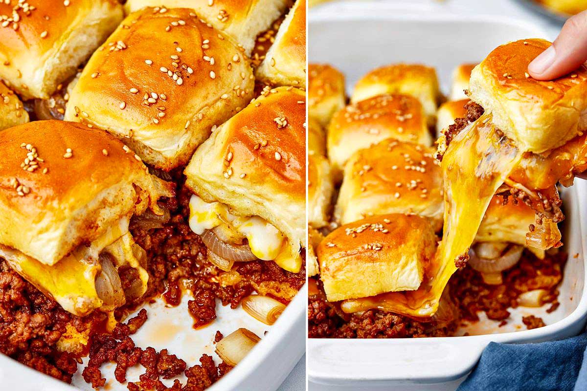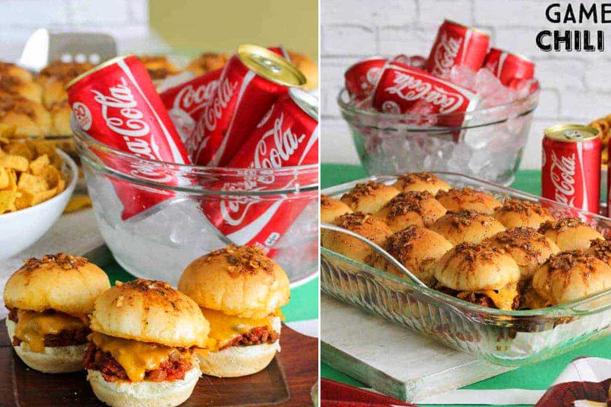 Sloppy Joe Sliders are the ultimate game-day food. Sloppy joe meat on top of slider buns with melty cheese and Coca-Cola onions with a yummy glaze, all baked up until bubbly, it doesn’t get any better than this easy recipe!