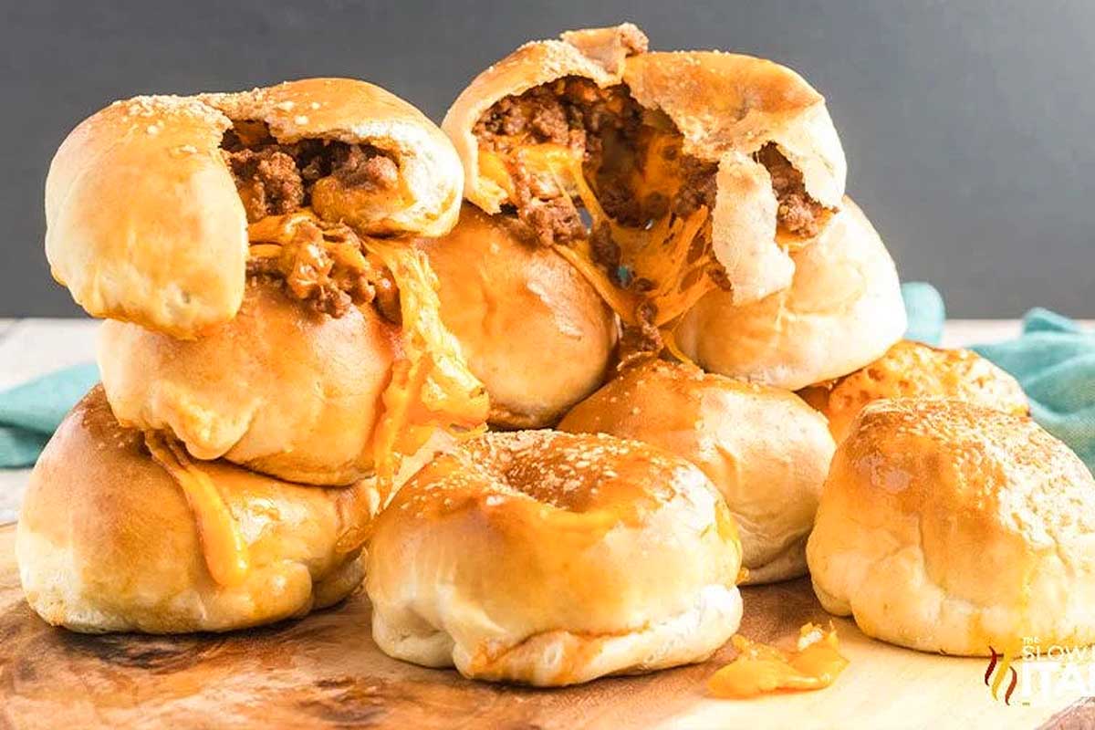 Sloppy Joe Bombs are bursting with saucy meat and gooey cheese. Make these stuffed pretzel bites today, and everyone will be begging for more!